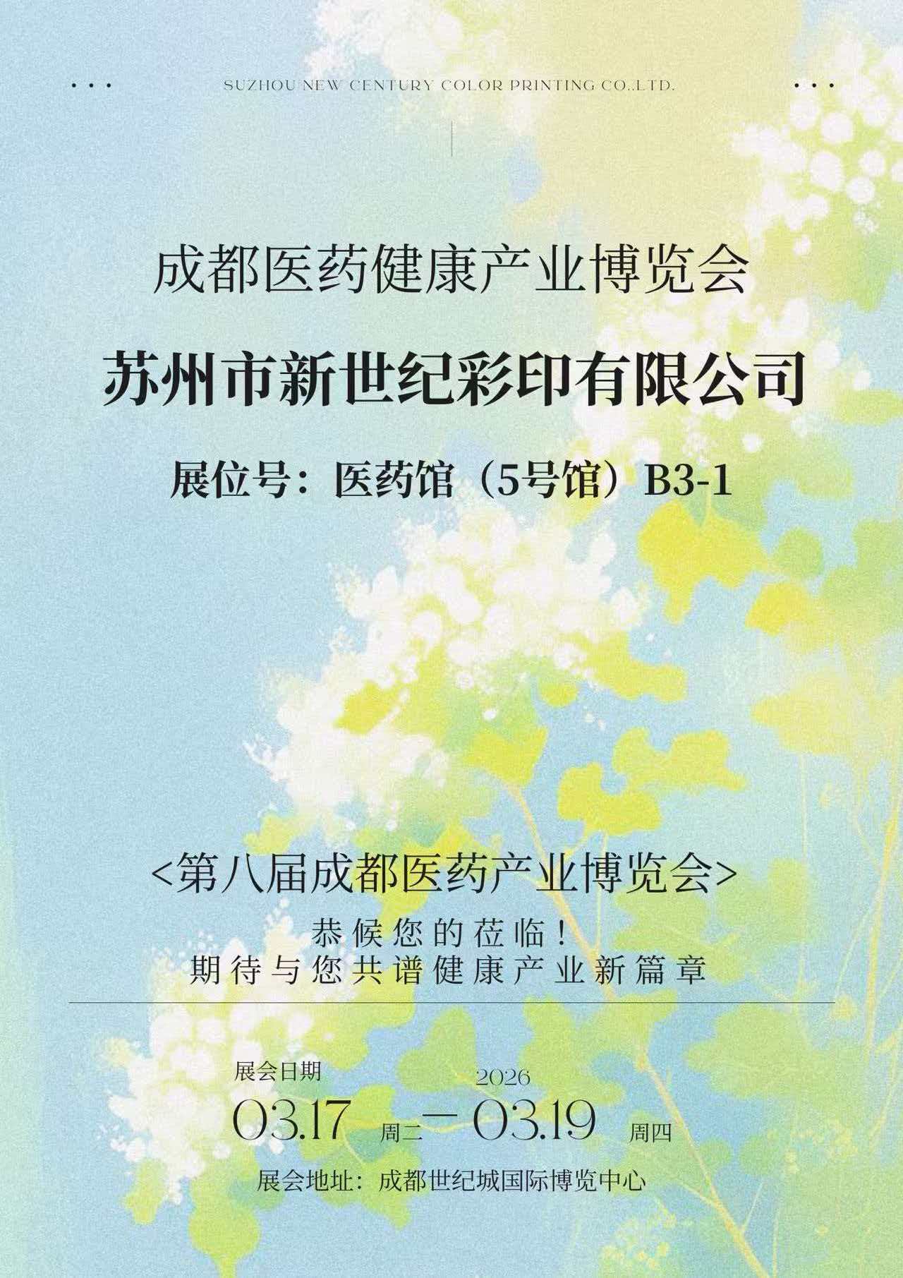 Van 17 tot 19 maart 2026 werd de 8e Chengdu Medical and Health Industry Expo groots gehouden in het Internationaal congres- en expositiecentrum Chengdu Century City. Suzhou New Century Color Printing Co., Ltd. (hierna "New Century Printing" genoemd) onthulde op de beurs haar nieuwste prestaties op het gebied van farmaceutische verpakkingen. stand B3-1 in de Farmaceutische Hal (Hal 5), waar op uitgebreide wijze haar uitgebreide kracht op het gebied van het printen van farmaceutische verpakkingen, structureel ontwerp en compliance-diensten wordt getoond. Het trok talloze farmaceutische bedrijven en experts uit de industrie aan om te stoppen en ideeën uit te wisselen.